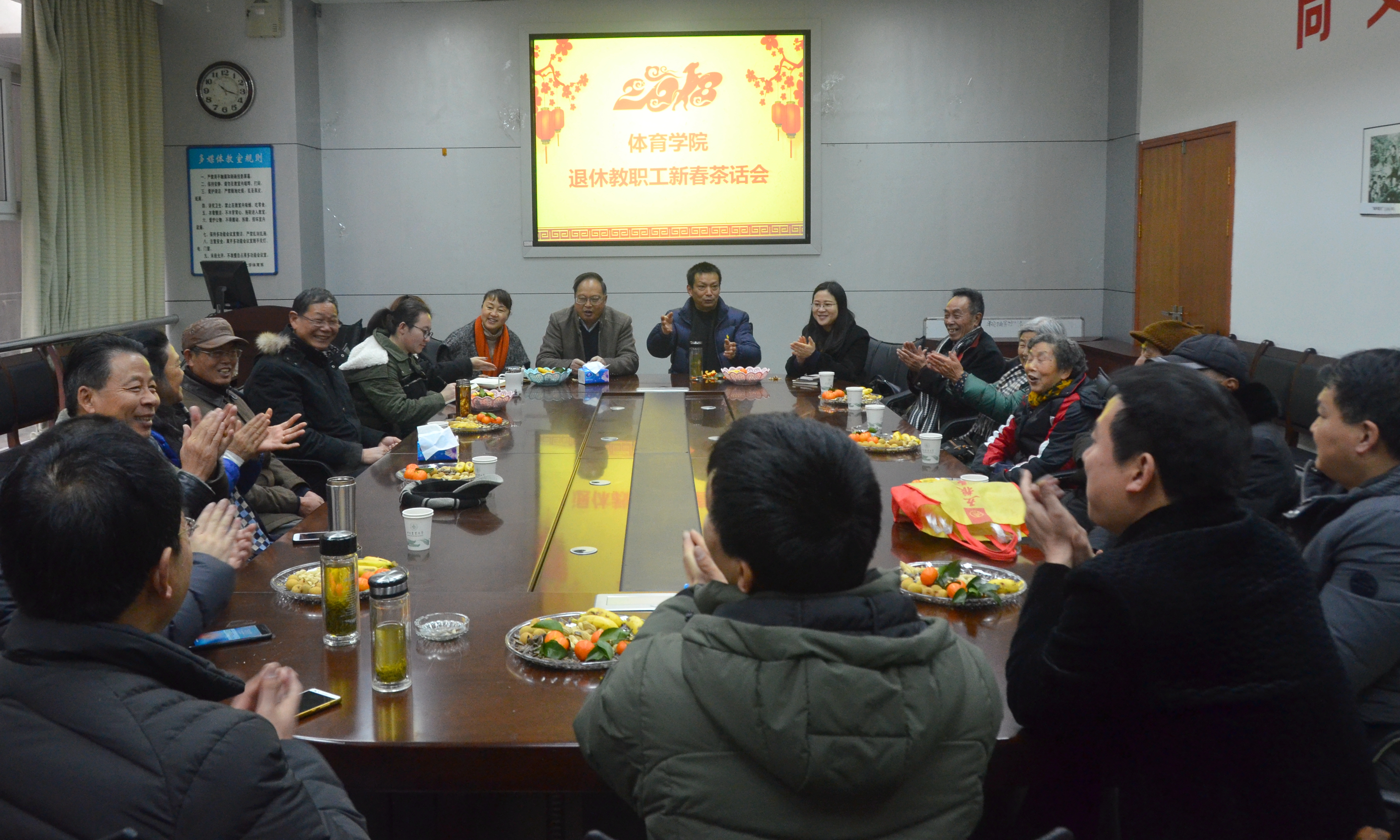 1月22日上午,学院在原体育系会议室举行了2018年退休教职工新春茶话会。院长邓跃宁、党委书记兼副院长王建强、副院长杨英、党委副书记蒋颖、各系室主任与学院9名退休教职工工欢聚一堂,共迎新年,述说恩情,畅谈学院发展形势,展望学院发展前景。茶话会由蒋颖主持。