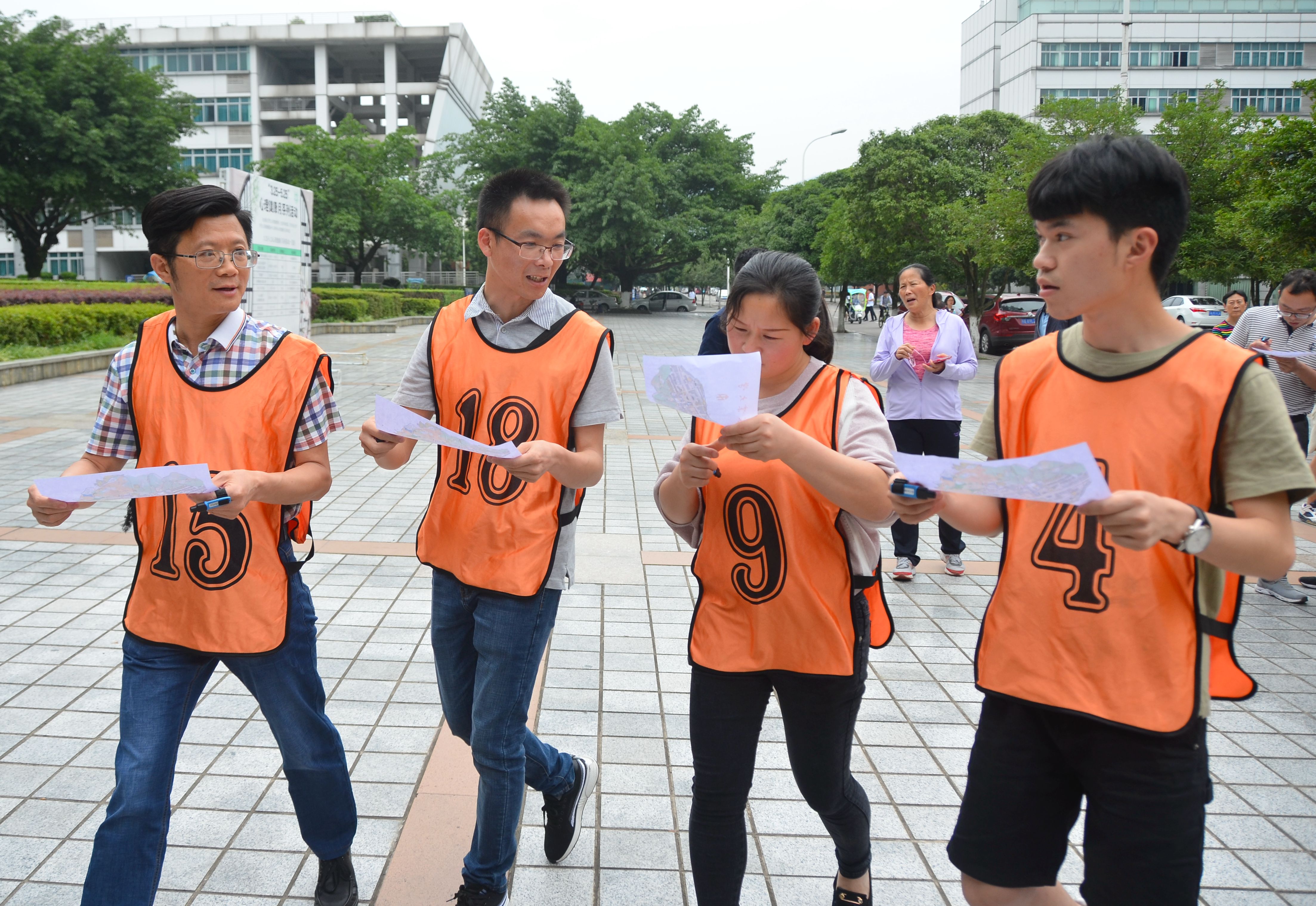 定向越野赛吸引了三个学院近30名教职工参加,随着裁判员翟亮一声令下,随机组成的7支队伍,拿着地图带着指卡冲向自己寻找的30多个目标点:小山坡、大道旁、灌木丛、篮球场……由于目标点覆盖第二教学区各个角落,非常考验队员们的体力和耐力以及定位能力。男队员们主动担起重任,寻找分布开阔、距离最远和位于山林中的目标点,把平地易寻的密集目标点分配给女队员。寻找目标点的各组途中组建微信群,通过群信息告知目标点情况,并配合队员判断目标点位置。每一次成功的找点,完成一次跨越,享受一次成功;每一次找点,忘记了身体的疲劳,忽略了路途的遥远,完成了难以想象的奔跑距离。整个过程是对团队力量、集体智慧、协调配合能力、个人身体素质等的全面检验,把活动主题体现得淋漓尽致。