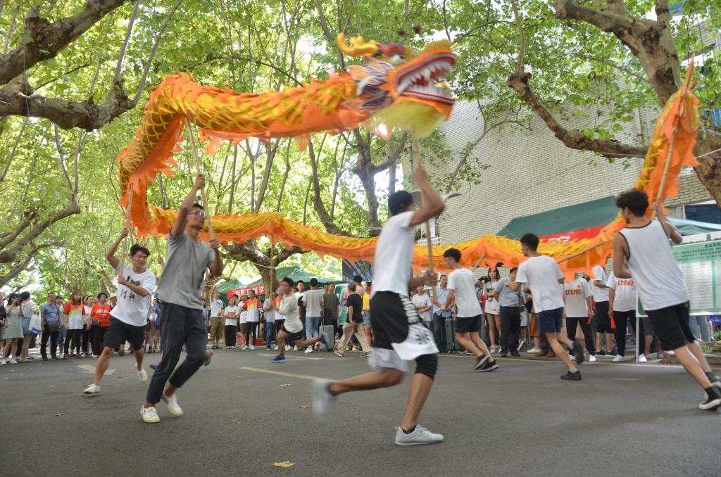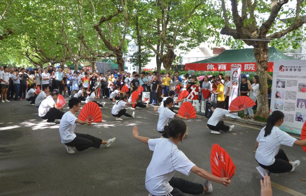 “砰砰砰”上午十点,伴随音乐响起,身着白色体恤的同学们举着金黄色巨龙从梧桐大道一侧霸气跑出。行进中的巨龙或盘旋、或翻滚,表演了一出出巨龙腾飞、金龙献瑞等精彩好戏,舞龙队的精湛表演引来了一片叫好声。舞龙的兴奋感还未散去,由武术队女生组成的太极扇队表演接踵而至,她们整齐划一、铿锵有力,将武术扇融入太极这一传统武术,动静融合,起承转折,看点十足。武术队男生组成的拳+器械battle,更是将现场氛围推向又一个高潮。翻子拳、劈挂拳、长拳、朴刀、双鞭等轮番上阵,吸引了众多群众驻足观看拍照留念。“今天是我第一次来到雅安,学校很大很安静环境很好,超级喜欢,没想到还有快闪活动,超级惊喜!”来自重庆彭水的2019级社会体育指导与管理2班的赵金洪同学兴奋表示。