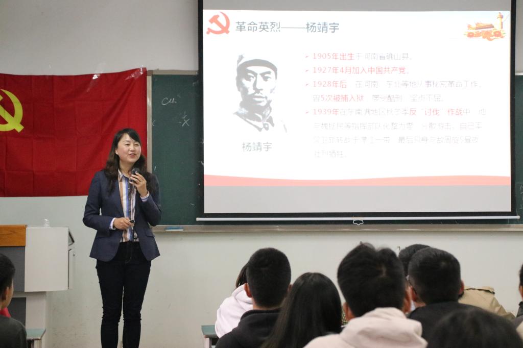 杨英从新中国成立70周年国庆阅兵色彩看中国军队发展引入,一下抓住了聆听者的眼球,现场气氛高涨。整堂党课分为中国共产党人的初心使命、中共第一次代表大会、革命英雄典型事例、当代大学生的责任和使命四个部分。中国共产党人的初心和使命,就是为中国人民谋幸福,为中华民族谋复兴。中国共产党第一次全国代表大会召开,确立了党的名称,制定了党的纲领,明确了中心任务,选举了领导机构。但第一次全国代表大会的代表们践约信念奋斗终生的比例为15%,英勇献身视死如归的比例为31%,可见坚守初心和使命并不是一件轻而易举的事情,需要信仰。江姐、杨靖宇、“两弹一星”先进群体、黄旭华、袁隆平、周开达等革命典型的视频感染人心。最后,杨英引用习近平总书记对新时代中国青年的讲话与同学们共勉,一要树立远大理想;二要热爱伟大祖国;三要担当时代责任;四要勇于砥砺奋斗;五要练就过硬本领;六要锤炼品德修为。希望同学们做有家国情怀勇于担当的时代大学生。